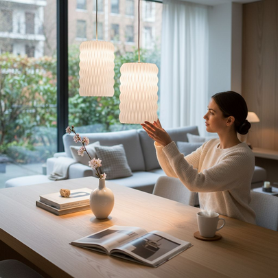 Chaque suspension Fleur de Brume est une pièce unique, façonnée grâce à l'impression 3D en PETG translucide. Sa teinte rose poudré et sa texture délicate créent une atmosphère douce et enveloppante, idéale pour un salon, une chambre ou un coin lecture.